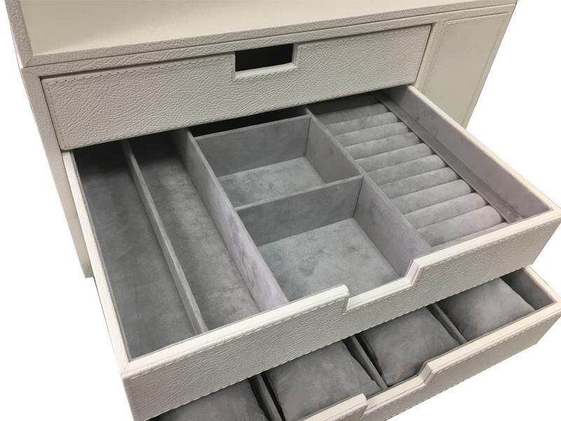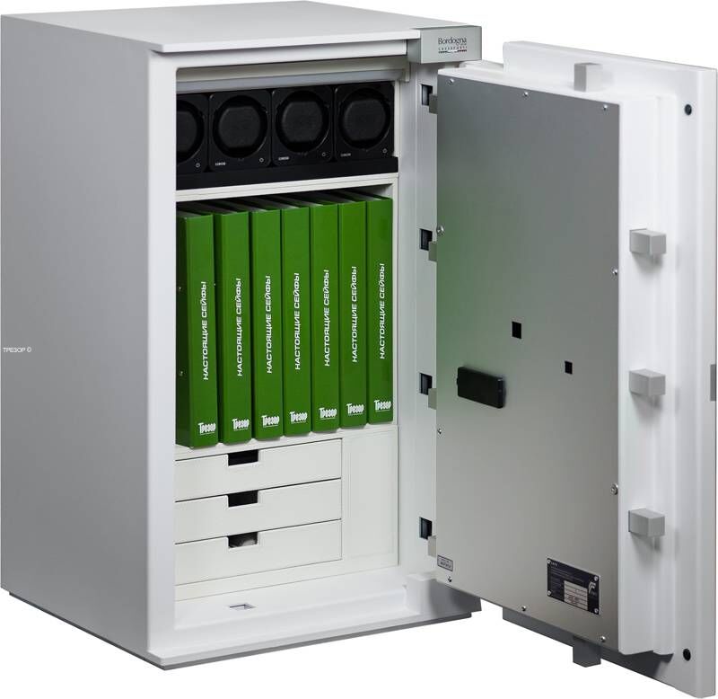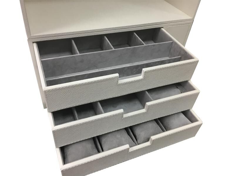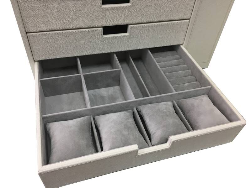 Специальный модуль для хранения ювелирных украшений изготавливается из автомобильной кожи и алькантары выбранных заказчиком оттенков. Представленная модель на 3 ящика адаптирована для установки в сейфы Brixia с ограниченным 90º открыванием двери. Только такая конструкция даёт возможность полностью вытаскивать из сейфа каждый из ящиков, внутренняя начинка которых производится под индивидуальные потребности заказчика, что может влиять на стоимость конкретного изделия. Отсек в "мёртвой" зоне может быть как открытым, так и закрытым, как на фото. Дополнительно приведён пример использования такого модуля в сейфе BRIXIA размера 4 вместе с модулем автоподзавода 4 часовых механизмов и интегрированной подсветкой интерьера. Интерьеры изготавливаются под заказ в течение 4-6 недель в зависимости от выбранных материалов и наполнения ящиков. Высота ящиков и прочие размеры могут быть изменены.