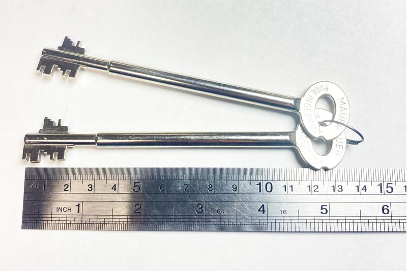 Комплект (пара) ключей для перепрограммируемого сейфового замка Mauer 70091. Базовый комплект имеет длину 135 мм.