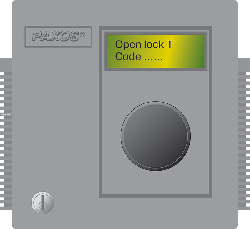 Электронный замок PAXOS со скрытым вводом шифра наборным барабаном, класс C. Отличительной особенностью этого замка является так называемая redundant архитектура, то есть реализация полного дублирования всех узлов, обеспечивающая повышенную надёжность. Обеспечивает возможность двухзамкового исполнения, когда одна клавиатура управляет двумя независимыми замками. Что позволяет использовать его на сейфах классов начиная с VI.