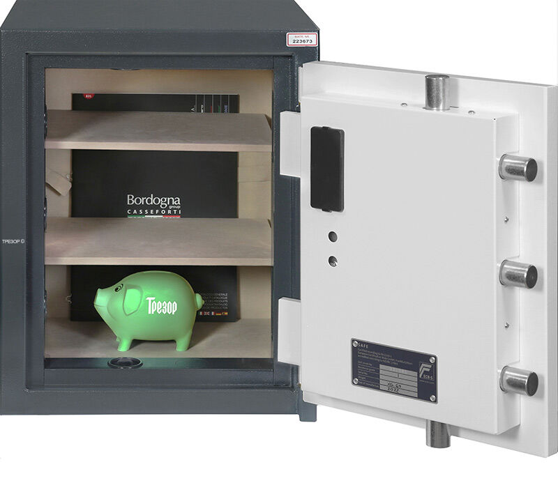 Стенки корпуса сейфа Bordogna Akra AV 36SE заполнены устойчивым к механическому и термическому воздействию эластичным наполнителем. Четыре из пяти сторон корпуса представляют собой тройную стенку. Стальные части стенок корпуса сделаны при помощи технологии холодного прессования. Толщина внешнего слоя составляет 3 мм, а внутреннего — 2 мм, при этом внутренний слой выполнен из специальной ферритонасыщенной стали. Толщина металла двери: 20 мм, диаметр ригелей: 25 мм.