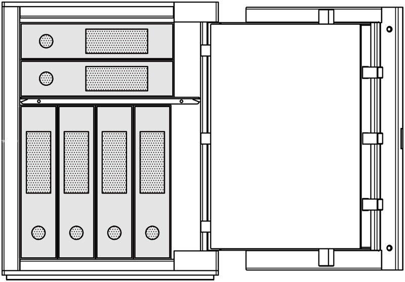В базовой версии комплектуется одной полкой, что позволяет разместить вертикально полный ряд папок и ещё несколько положить горизонтально. Ознакомиться с возможными вариантами внутреннего оформления можно в специальном разделе сайта, посвящённом аксессуарам, а посмотреть буклет завода - в прикреплённых документах.