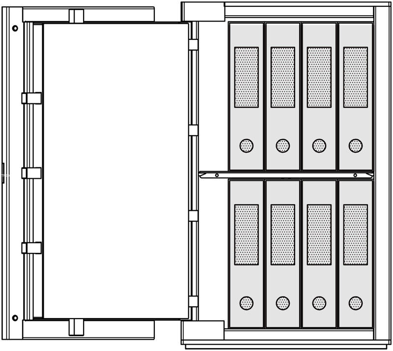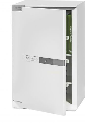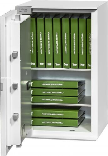 Стандартный интерьер состоит из двух полок с удобным шагом по высоте внутри сейфа, что при хранении папок с документами позволяет выбрать несколько разных вариантов их размещения. Премиум качество снежно белой окраски позволяет не прятать сам сейф от посторонних глаз и не бояться за сохранность хранящихся внутри ценностей.