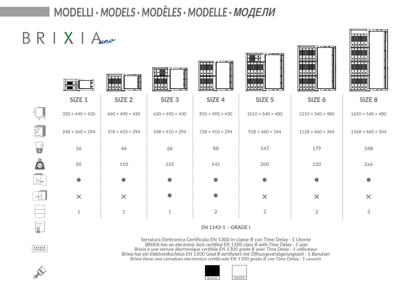 Сейфу Brixia 5 можно спокойно доверить не только важные документы, но и ценности: продуманный объем рассчитан на 2 ряда папок А4 типа Корона и пространство для хранения часов и ювелирных украшений. Все подробности в буклете завода в прикреплённых файлах.