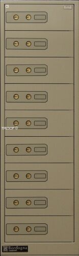 Две стойки, скреплённые и поставленные друг на друга, образуют стандартную стойку банковского депозитного хранилища. Установленные рядом умещаются под стойкой ресепшн. Монтируются внутри взломостойких шкафов или сейфов Bordogna.