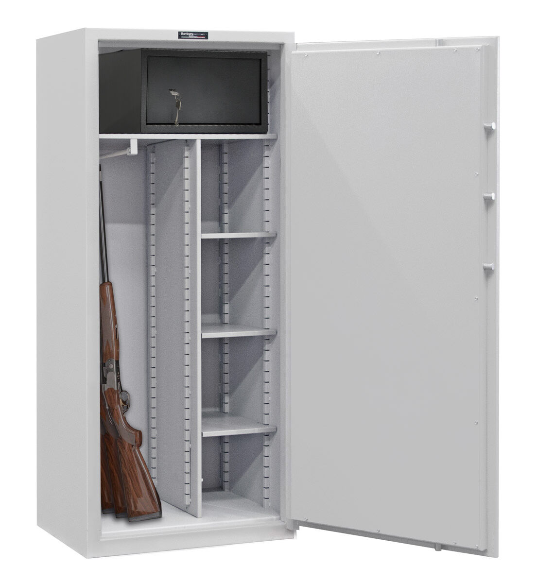 Специальное "оружейное" исполнение шкафа Bordogna 3200 для частных лиц включает в себя электронный замок, Т-образный разделитель интерьера, позволяющий хранить разнообразное имущество на 4-х полках правой половины и 6 держателей для длинноствольных ружей. На всерхней полке можно установить дополнительный сейф из производственной программы завода или от стороннего производителя, как изображено на фотографии.