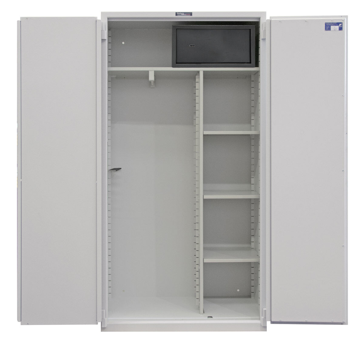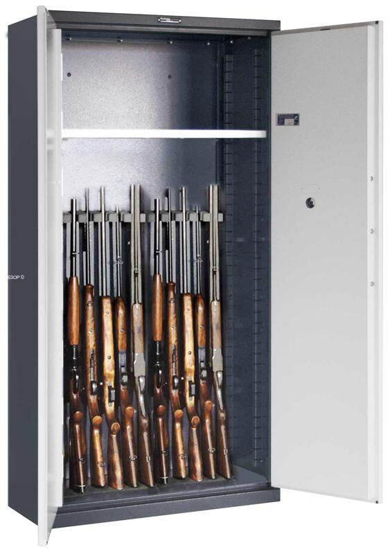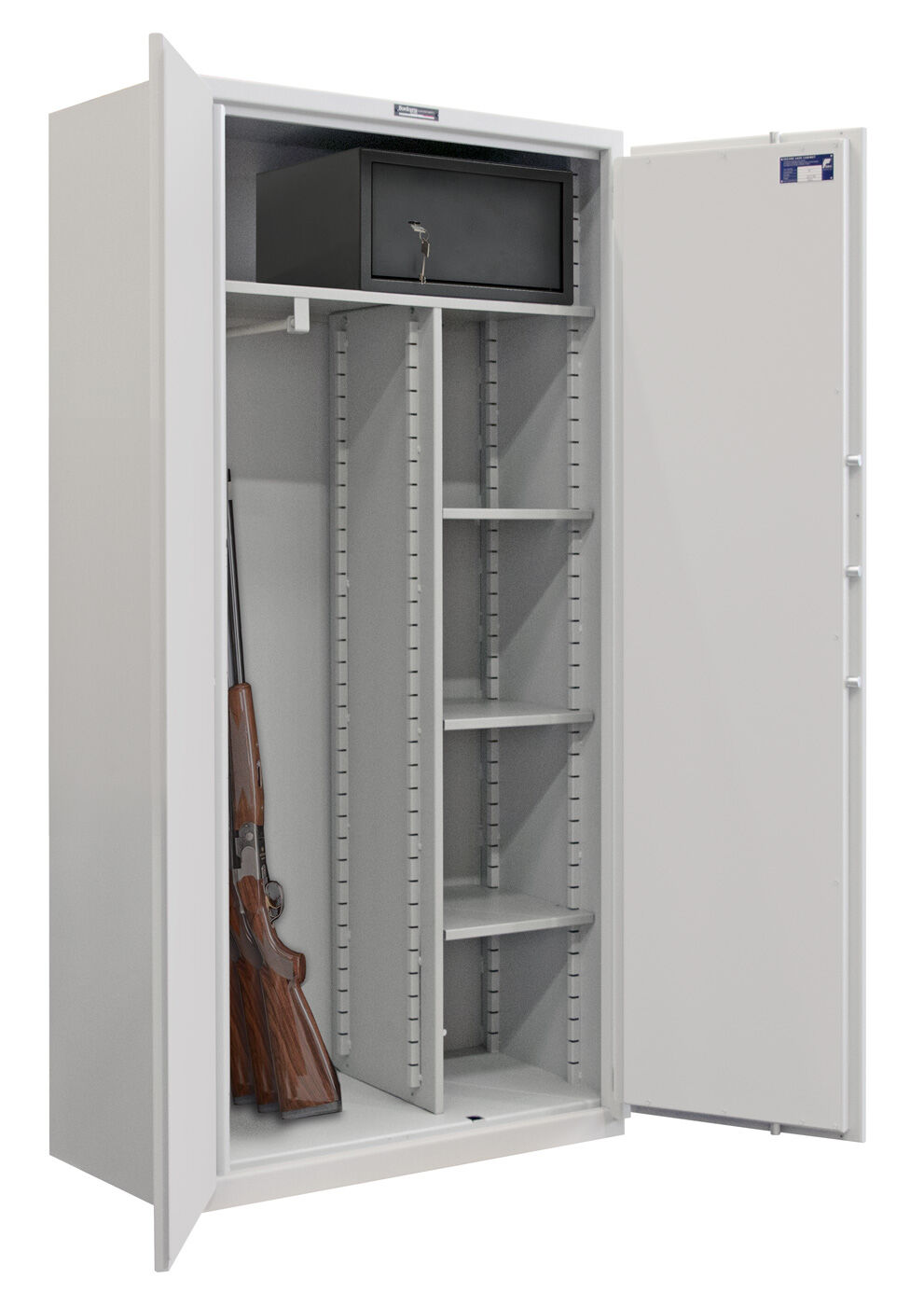 Оружейная версия оснащена электронным замком, Т-образным разделителем интерьера с 4 полками и держателем для 6 стволов. Доступно исполнение без разделителя, но с держателями на 14 стволов - специализированная версия для стрелковых клубов и тиров. Электронный замок позволяет установку различных вариантов расширений, позволяющих осуществлять контроль доступа по времени и календарю, вести реестр количества открываний и осуществлять дистанционный мониторинг или блокировку.