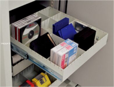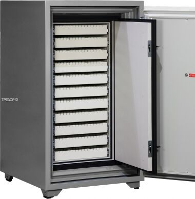 Модель оснащается 11 универсальными выдвигающимися ящиками. Сейф может быть заказан с шестью ящиками - индекс этой модификации - DE. Вмещает (по информации производителя) до 1276 DAT или 564 CD или 399 LTO. Рекомендуем купить для хранения резервных копий данных с серверов небольшого предприятия. Пустая или с оснащённая только полками версия отлично подойдёт для хранения неформатных информационных материалов типа рентгенограмм или томограмм, фото и кино плёнок.