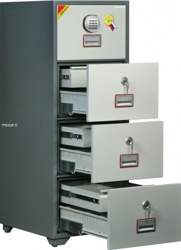 4-х ящичный файловый огнестойкий (60 минут) сейф (картотека) Diplomat DFC 4000 D4, с электронным замком на верхнем ящике и ключевыми замками на нижних. С 4-мя дополнительными внутренними выдвигаемыми ящиками, идеален для хранения бланков паспортов, трудовых книжек и тп.