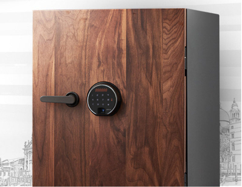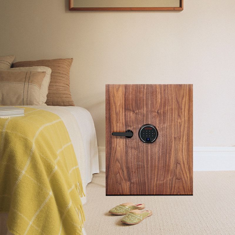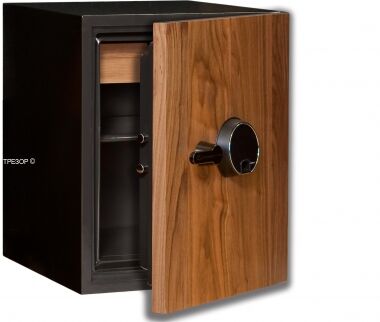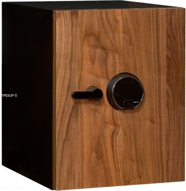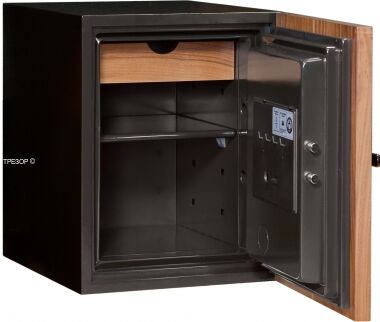 Офисный огнестойкий сейф премиум DBAUM 500: декоративная панель из массива ореха, выдвигаемый ящик с деревянной отделкой для мелких предметов, полка, электронный биометрический замок нового поколения с сенсорной клавиатурой.