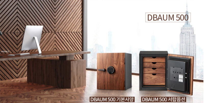 Офисный огнестойкий сейф премиум серии DBAUM 500 (на базе классической серии 530): декоративная панель (отделка шпоном ореха), выдвигаемый ящик с деревянной отделкой для мелких предметов, полка, электронный биометрический замок нового поколения с сенсорной клавиатурой, корпус и дверь — стальной прокат толщиной около 1 мм, заполненный огнеупорным композитом (вспененный бетон), стальная ручка и класс огнестойкости 60 Р для бумаги.