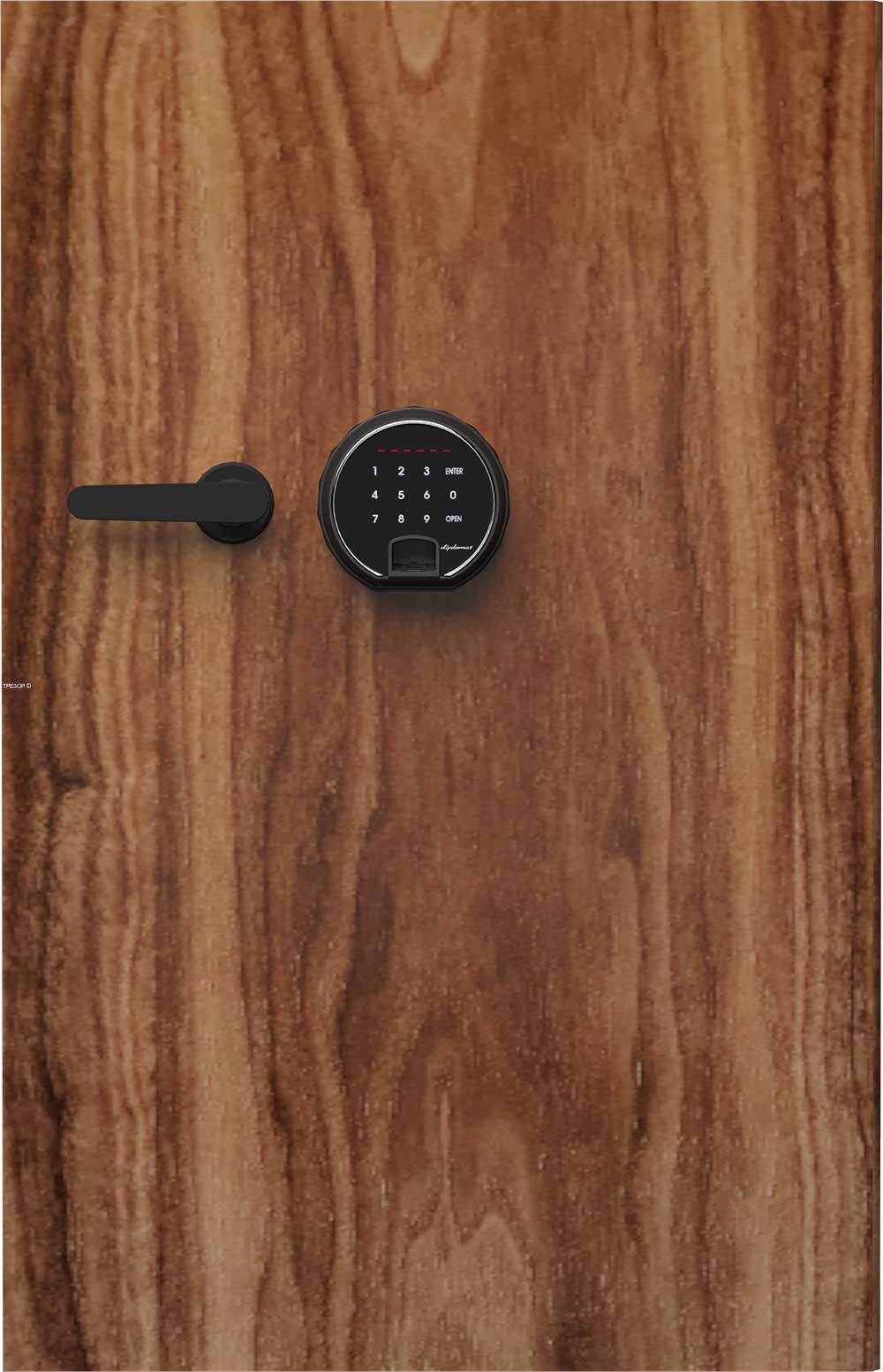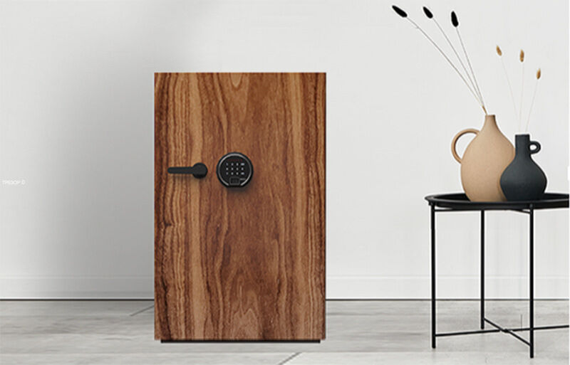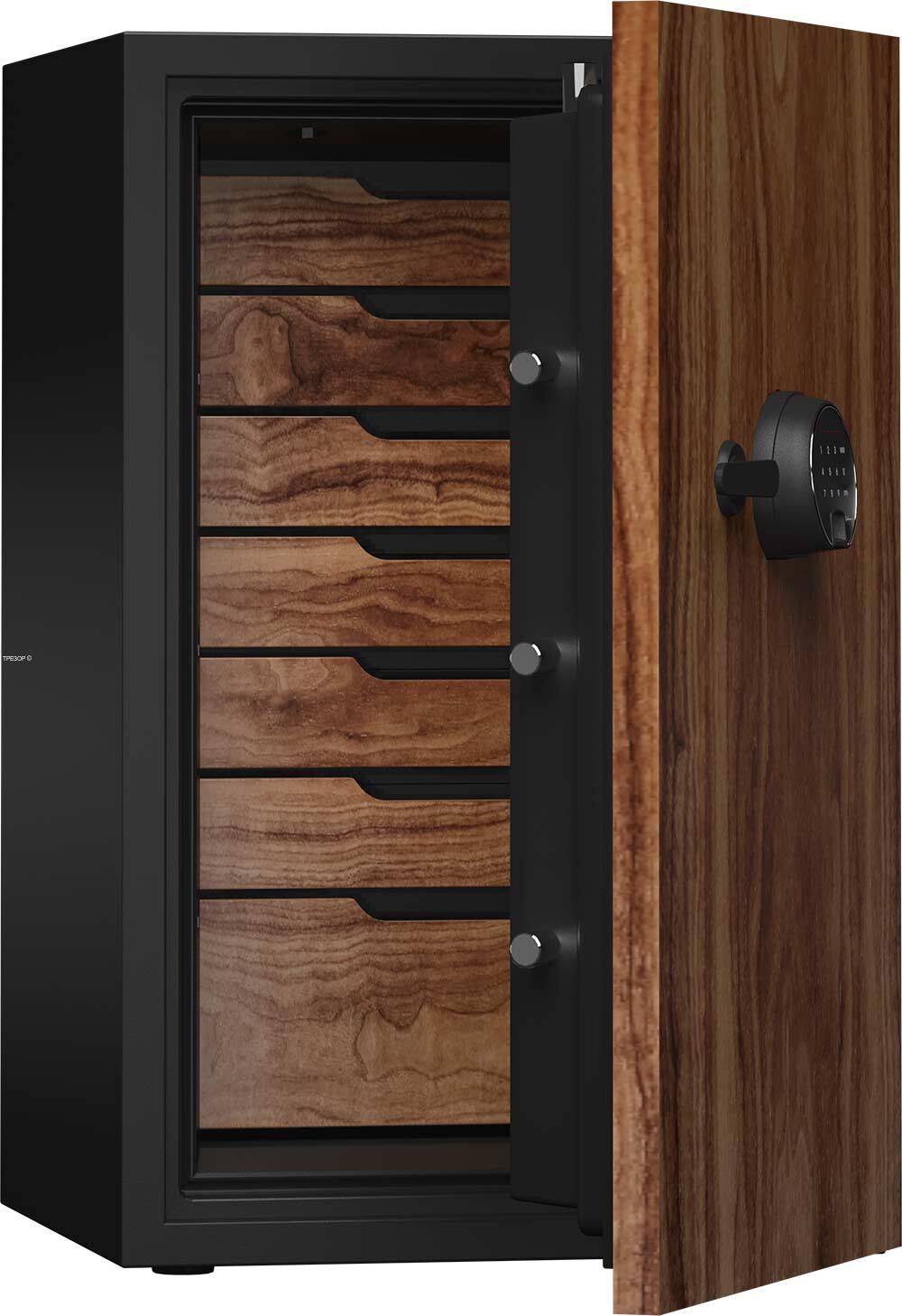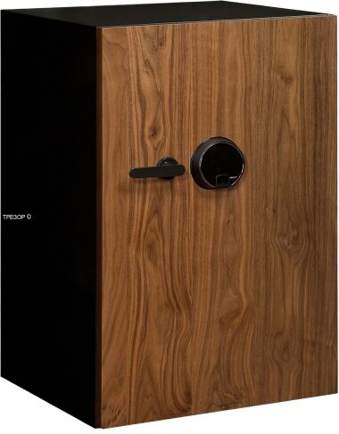 Офисный огнестойкий сейф премиум серии DBAUM 800S (на базе классической серии 080): декоративная панель (отделка шпоном ореха), 7 выдвигаемых ящиков с деревянной отделкой для мелких предметов, полка, электронный биометрический замок нового поколения с сенсорной клавиатурой, корпус и дверь — стальной прокат толщиной около 1 мм, заполненный огнеупорным композитом (вспененный бетон), стальная ручка и класс огнестойкости 90 Р для бумаги. RAL 9017