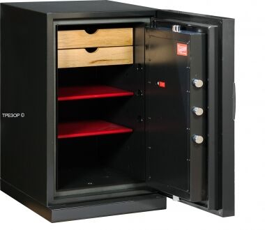 Премиум офисный сейф NEXT 7500 2-го поколения с вишнёвой панелью от компании Diplomat сочетает в себе традиционную огнестойкость с защитой от взлома (RSC UL, S2). Благодаря декоративным панелям, сдержанному и стильному дизайну украсит собой любое помещение. Выполнены в стиле сейфов KASO, интерьер имеет дополнительный отсек для хранения ювелирки, увеличенные ригеля, специальный противодымный уплотнитель двери.
