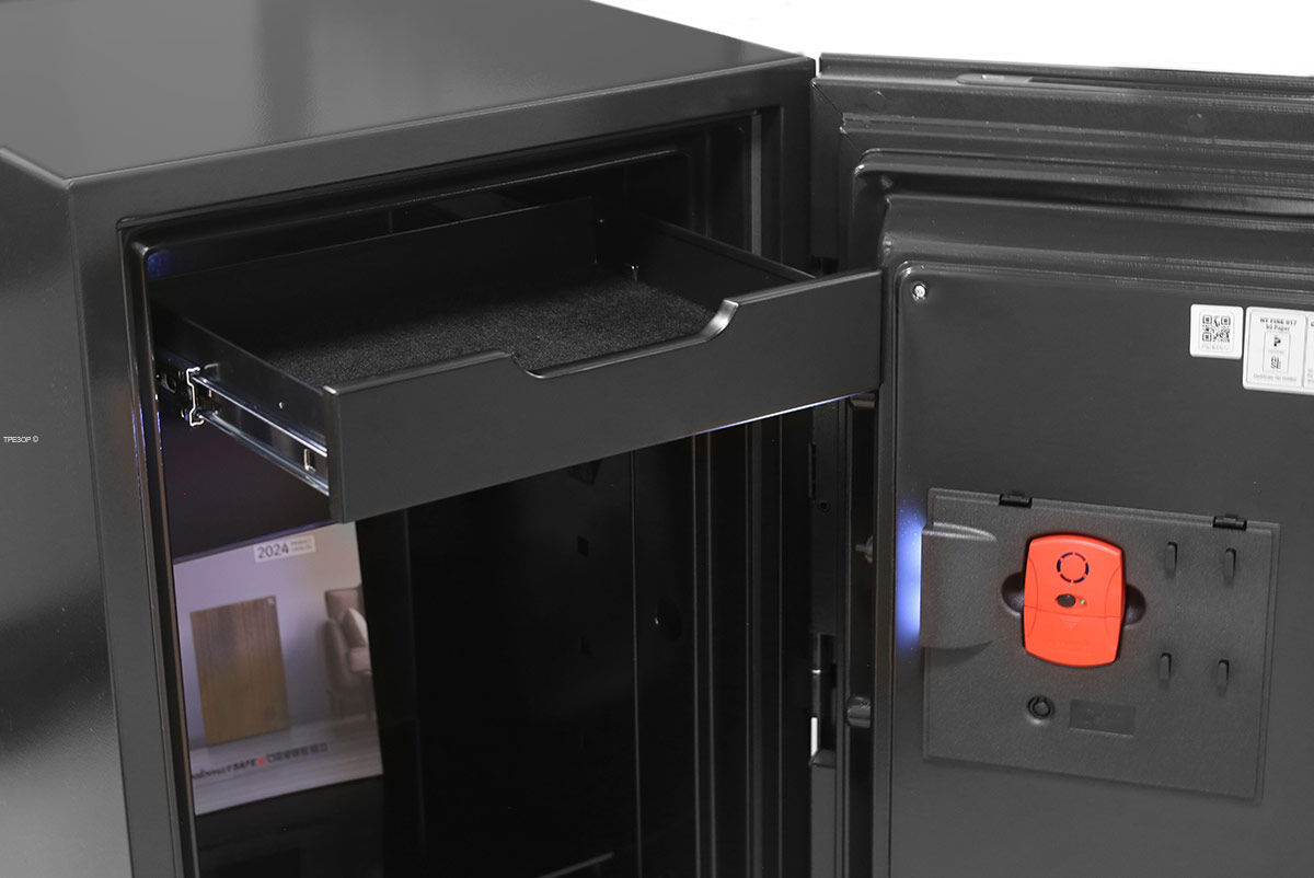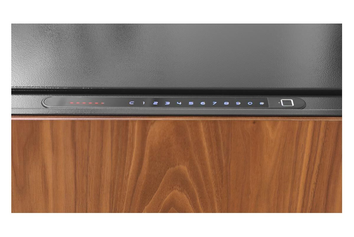 Эргономичный сейф от пожара и взлома с панелями из шпона дерева и электронно-биометрическтим замком.