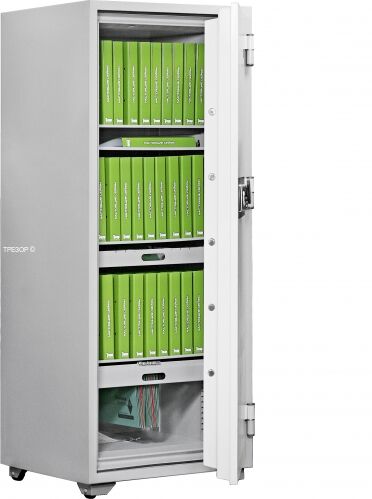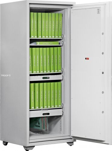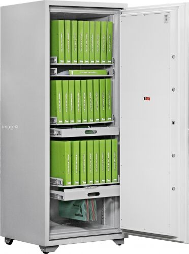 Теперь работа с надёжно защищёнными от огня документами станет намного более комфортной. Уже не надо нырять вглубь сейфа за далеко запавшей папкой и метаться от сейфа для папок к сейфу для подвесных файлов, перебегая затем к картотечному сейфу с трудовыми книжками и после кланяться сейфу для магнитных носителей. Серия Diplomat PDH - всё необходимое в одном флаконе!