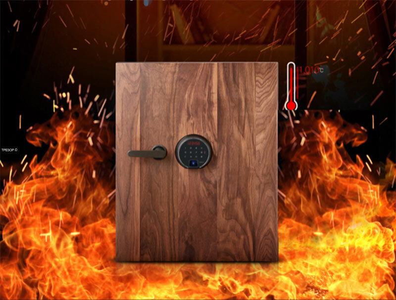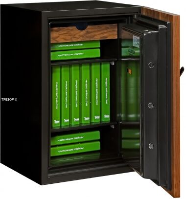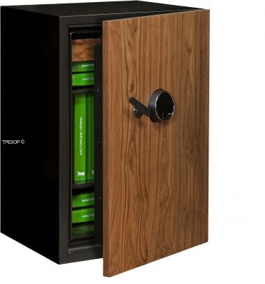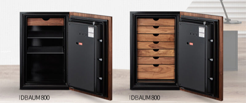 Офисный огнестойкий сейф премиум серии DBAUM 800 (на базе классической серии 080): декоративная панель (отделка шпоном ореха), выдвигаемый ящик с деревянной отделкой для мелких предметов, полка, электронный биометрический замок нового поколения с сенсорной клавиатурой, корпус и дверь — стальной прокат толщиной около 1 мм, заполненный огнеупорным композитом (вспененный бетон), стальная ручка и класс огнестойкости 90 Р для бумаги.