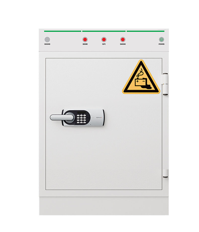 Специальный огнестойкий сейф для обеспечения безопасной зарядки литиевых аккумуляторов, сертифицирован в соответствии с VDMA 24994 (E-CBS). Оснащён специальным кабельным каналом и распаечной коробкой на задней стенке. В стоимость включена система вентиляции и доводчик для обеспечения автоматического запирания двери.