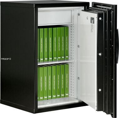 В базовой комплектации поставляется с изящной серой декоративной панелью, внутренним отдельным запираемым отделением, переставляемой по высоте полкой и самым современным электронным замком, существенно превосходящим требования стандарта. Более сбалансировано выглядит с окраской корпуса в чёрный цвет.