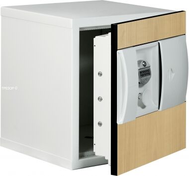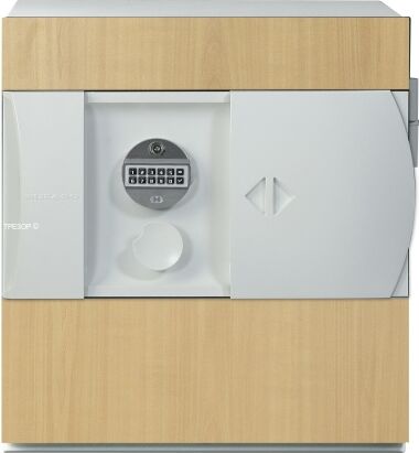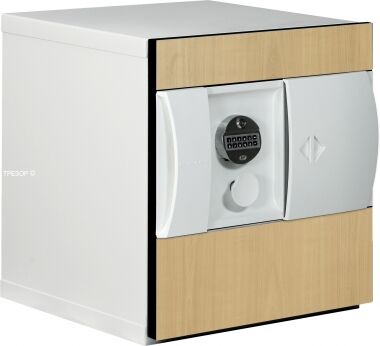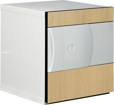 Огнестойкий и взломостойкий сейф KASO E2 308 производства Финляндии в базовой спецификации. Исполнен в белом цвете с декоративной панелью "берёза".