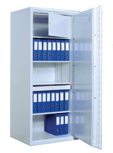 Сейф KASO PTK E1-370 может быть оснащен полками, рассчитанными на хранение документов в папках A4, в том числе и выдвигающимися, подвижными ящиками для хранения картотечных карточек, ключей или трудовых книжек, и запираемыми отделениями высотой 150 мм или 350 мм. Доступны специальные модули для разных потребностей. На фотографии изображён сейф с оптимизированным для хранения папок типа "Корона" опционным интерьером, подходящий для офиса.