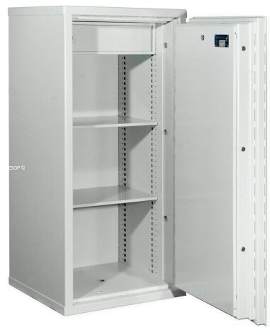 Сейф оснащен полками расчитанными на хранение документов в папках A4 (количеством до 27 штук) и запираемым ящиком высотой 150 мм.