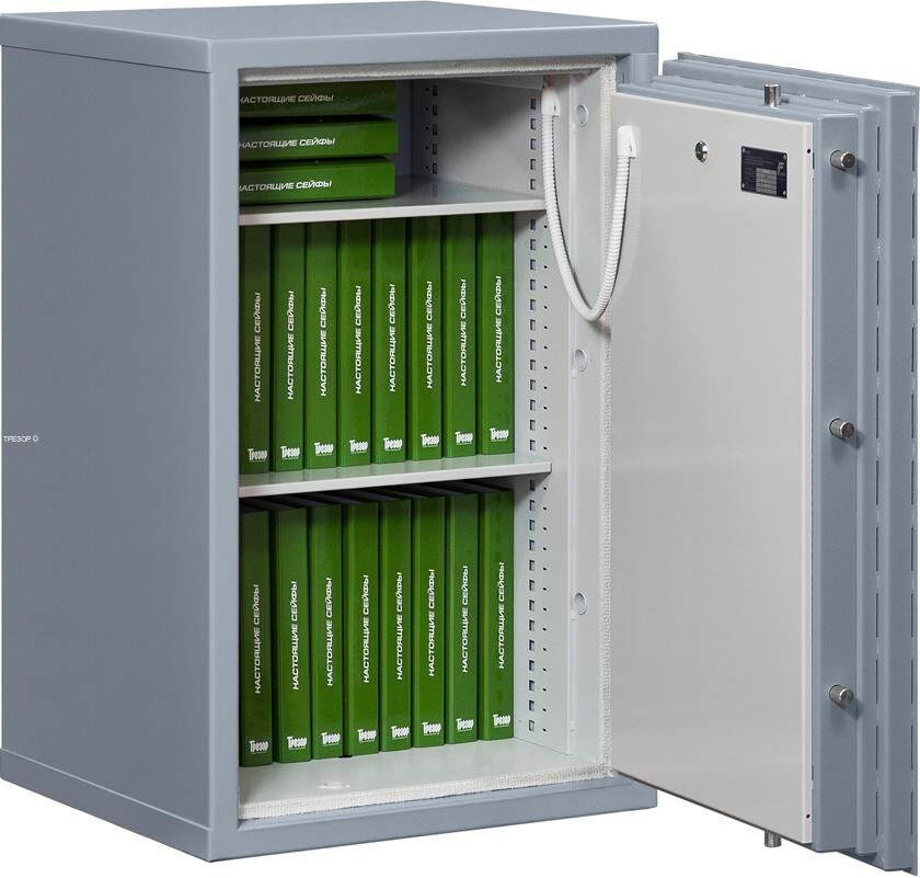 Сейф оснащен полками рассчитанными на хранение документов в папках A4 (количеством до 18 штук) и запираемым ящиком высотой 15 см. Возможна установка опций: выдвигающихся лотков для хранения ювелирных украшений, часов, монет и других ценностей.