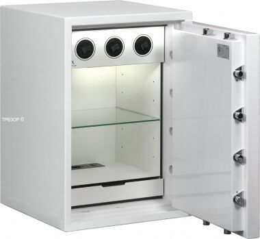 Сейф в эксклюзивном исполнении белого цвета, с модулем для подзавода часов, подсветкой, блоком для заряда гаджетов, стеклянной полкой и двумя выдвигаемыми ящиками для ювелирных украшений представлен на фотографиях и в выставочном зале.