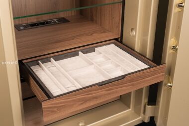 Все интерьеры выполнены из экологически безупречного и стойкого материала австрийского производства. Доступны 9 базовых цветов и 5 фактур дерева. Снаружи сейф окрашивается и лакируется эксклюзивными красителями, часть элементов (ручка, ригели и декоративные накладки на петли и ригельные стаканы) может быть хромирована или покрыта золотом.